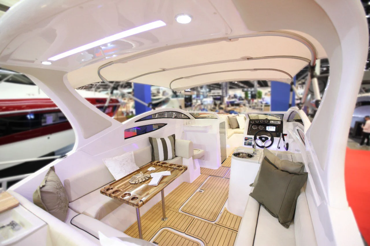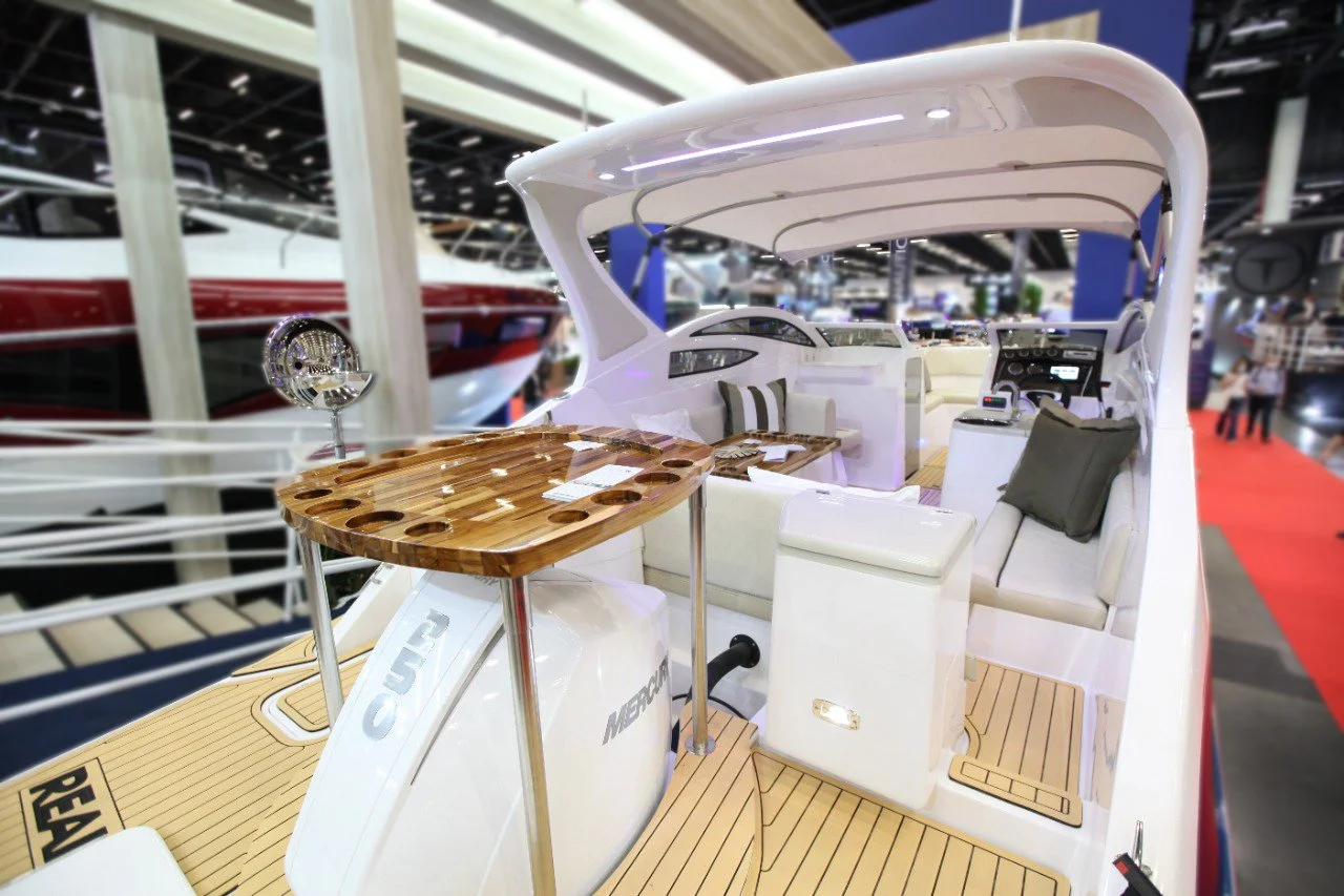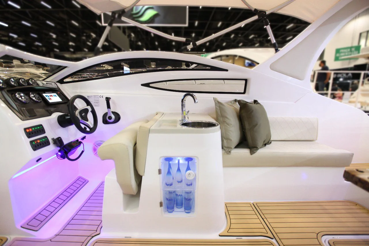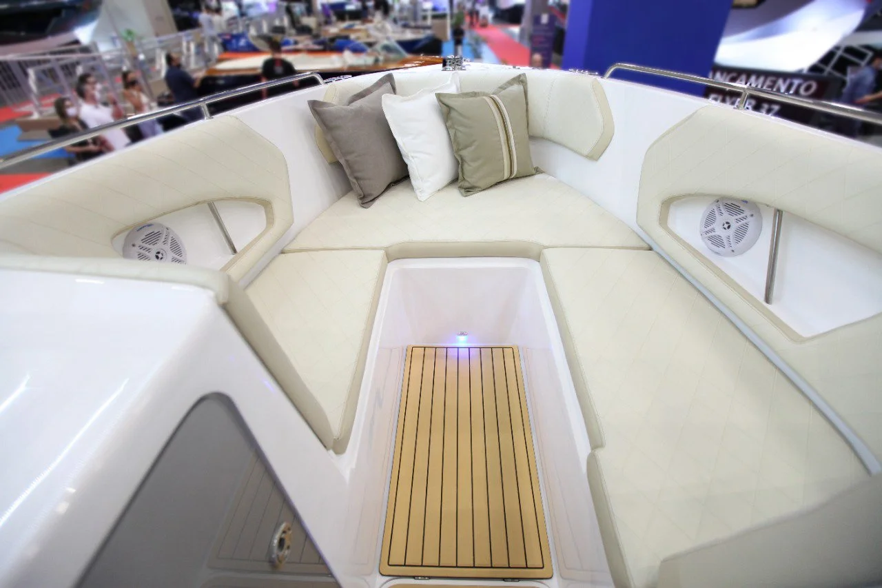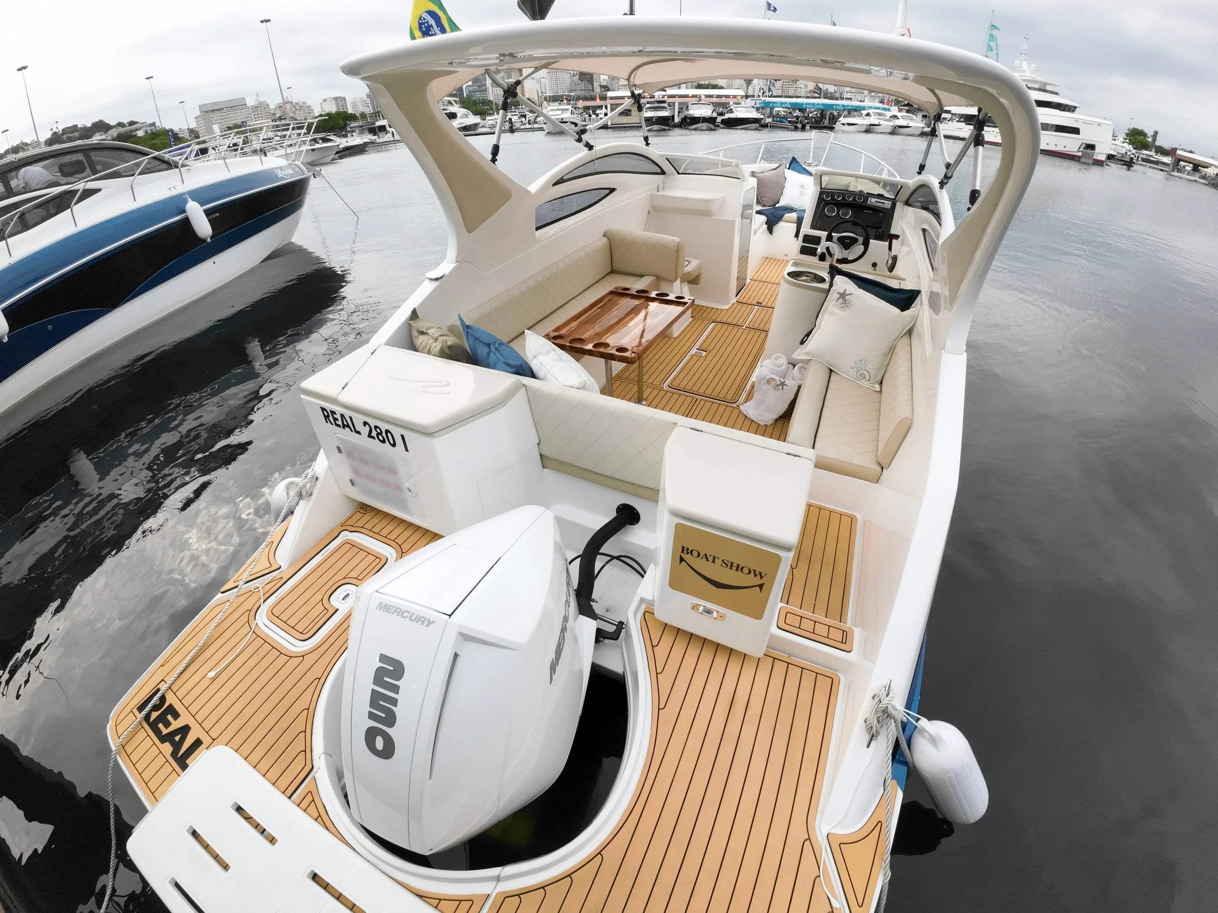 The Real 280 stands out for its intelligent use of platform space, even with the presence of the outboard motor. A stern platform surrounds the motor, ensuring efficient space utilization and added protection. This innovative design allows for the addition of a gourmet unit over the motor, creating a living area at the rear of the boat equipped with a table for four guests. Combining functionality and comfort, the Real 280 provides a pleasant and practical experience on board, making it an excellent choice for those seeking versatility and innovation in a vessel.