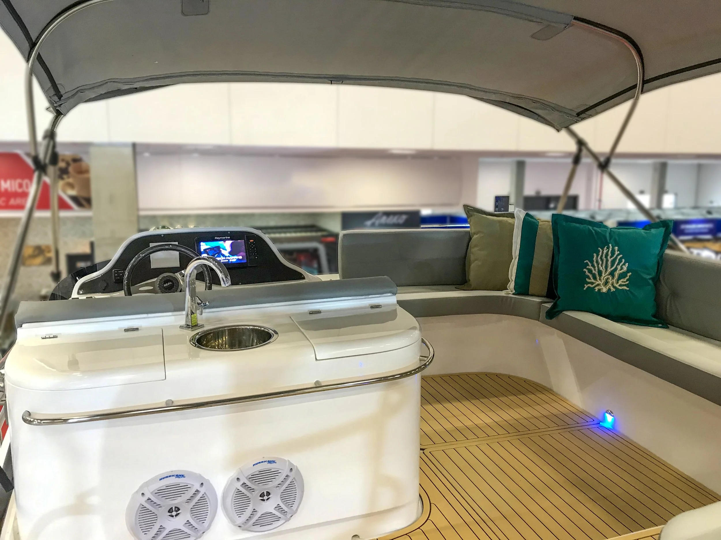The Real 415's spacious cockpit is one of its highlights. A large 'L' shaped sofa on the port side with storage under the seats, as well as a cooler, stainless steel sink, and trash can. It also has a self-draining floor system.